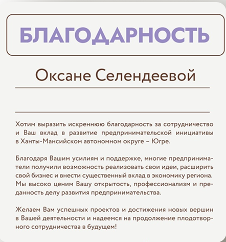 Благодарность Селендеевой Оксане за сотрудничество и вклад в развитие предпринимательской...