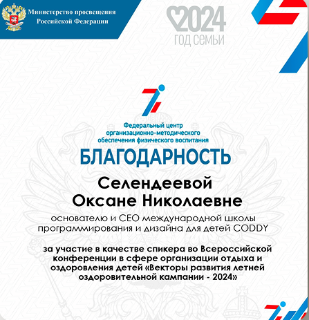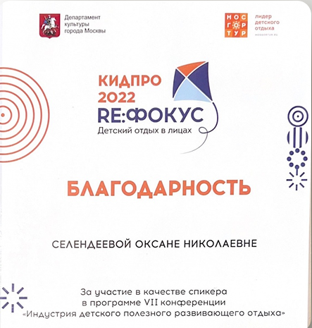 Благодарность Селендеевой Оксане за участие в качестве спикера во Всероссийской конференции в сфере организации отдыха и оздоровления детей «Векторы...